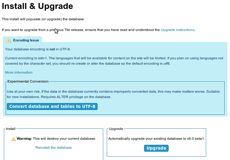 [+]티키 5.1 보다 이전 버전에서 티키 5.1 및 그 이후로 업그레이드 하는 경우, 위에 설명된 것처럼 tiki-install.php 스크립트를 최소한 한 번은 실행하는 것을 권장합니다, 그리하여 티키 5.1 이전의 데이터베이스에 존재할 수 있는 인코딩 문제를 수정합니다.