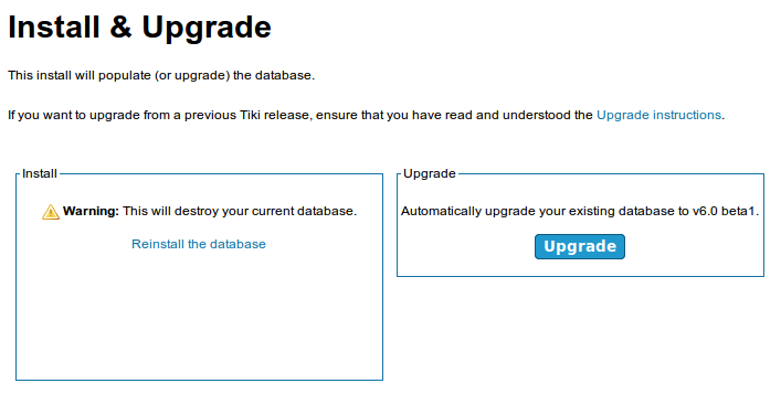 - 성공적으로 실행이 되고나면, 이 선택사항이 더 이상 보이지 않게 됩니다, 하지만 일반적 줄문, 즉 데이터베이스를 재설치를 원하는 지 혹은 새 티키 버전으로 "Automatically upgrade your existing database to" (기존 데이터베이스를 자동 업그레이드) 할 지 여부를 묻게 됩니다. 업그레이드 중이므로, 후자를 선택하십시오.