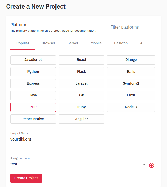 - Choose PHP as your platform, input the project name (yourtiki.org) and select your team