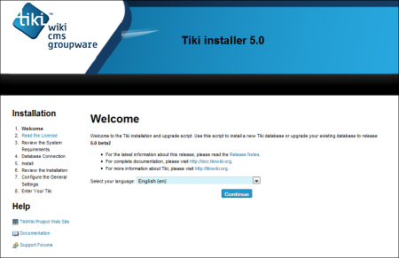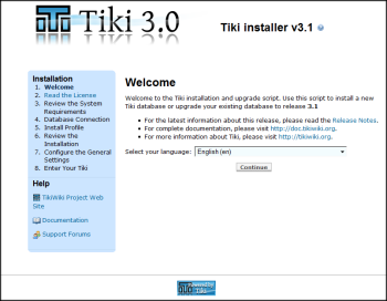 Die erste Seite des Tiki Installer erscheint. Dieser Installer erlaubt Dir: