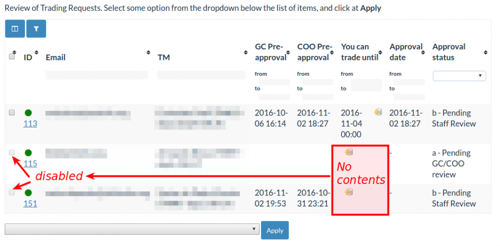 The code below disabled checkboxes from the items in a table generated with PluginListExecute where the 7th column (6th for jQuery, since it starts counting from 0) has no content in the cell. In addition, it disables the select all checkbox, since for some reason allowed to select the disabled ones by the time of this writing: