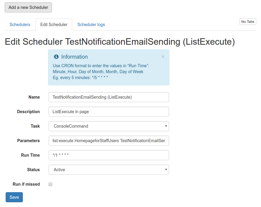 An internal scheduler is added to Tiki, so that only one cron job needs to be defined in the system crontab (or Windows Scheduled Tasks), and all actions to be run at scheduled times can then be defined from within the Tiki admin panel.