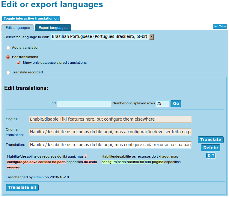 Continuing the work done for Tiki5 and Tiki6, several improvements to interactive translation and "Edit or export languages" (tiki-edit_languages.php) were done for Tiki7.
